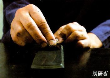 「呂色仕上げ」といわれる「炭研ぎ」「摺り漆」「磨き」を、職人が納得するまで繰り返すことで、フシや刷毛跡のない漆黒の平面に、深みのある艶が表現されます。
