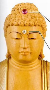 • 「智慧の光」を表す肉髻と「慈の光を表す白毫というありがたい光を、天然のダイヤモンドとルビーの永遠の光で表現したのが、天然石使用仏像です。