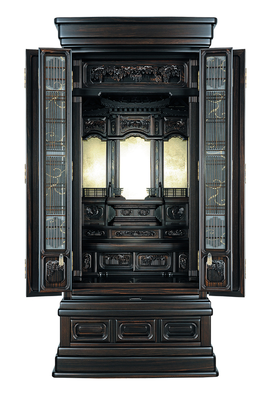 西方極楽浄土をこの世に現した「宇治の平等院」をモチーフにしたお仏壇です。美しい唐木を豊富に用い「国宝」の名に見合う三方練りやフローリング加工など細部に亘る仕上げに加えて本体の前面を穏やかなR曲面にする新しい技術も採用しています。ダイナミックで優雅な平等院の名にふさわしい仏壇となっています。